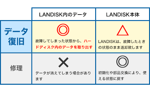そのため、「必要なデータがLANDISK内に残ったまま」「バックアップが取れていない」等の場合は、データ復旧を行ってから修理を依頼されることをお勧めします。