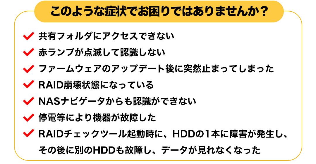 最近停電がありまして、それ以降アクセスができなくなりました、担当のシステム業者様に見ていただいたところ、LinkStation内のハードディスクに問題があると言われました。物理的な損傷のため私達ではどうする事もできなく御社に連絡をさせて頂きました。
