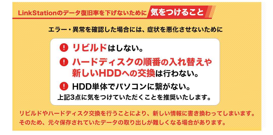 この度、診断復旧いたしました LinkStation LS-QVL ですが、ハードディスクを複数使用している機器です。複数ハードを使用している LinkStationは、RAIDシステムを組まれているものが多くあります、1本のハードがおかしくなったことで、アクセスが全くできなくなる状態になります。その際は、電源を切り通電をさせないようにして、異常の悪化を防いでください。
