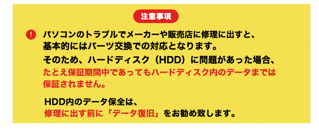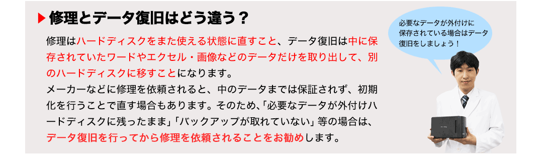 普段使っているHDDが急に認識をしないなどの事がありますので、データのバックアップを取るなどの対応手段を考えておくことが必要です。