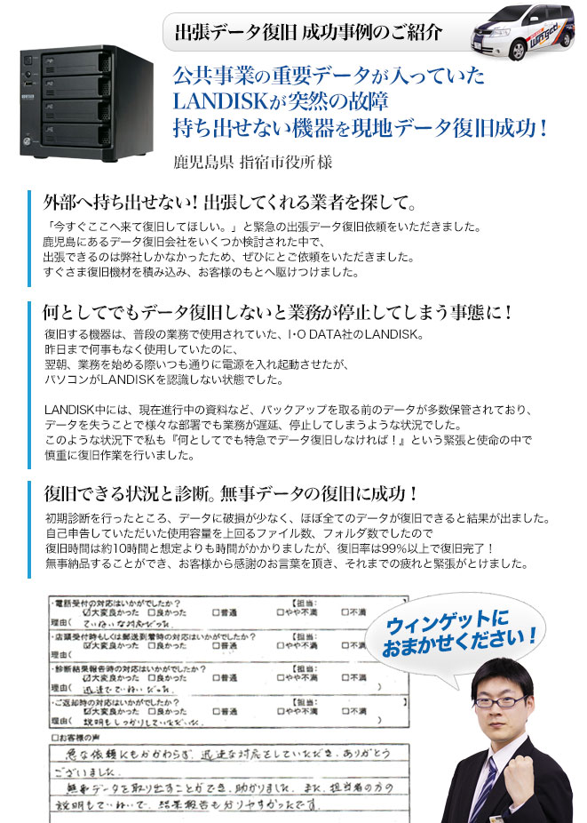 | 出張費無料でお客様の所へ伺います。 サーバ・NAS・外付けHDD・PCの出張データ復旧であれば、出張費無料でお客様の所へ伺います。 |