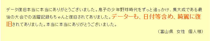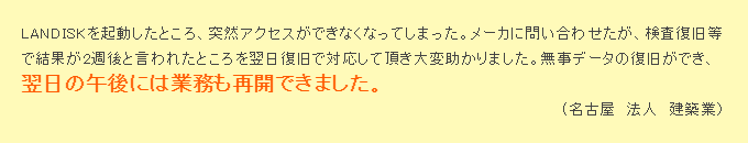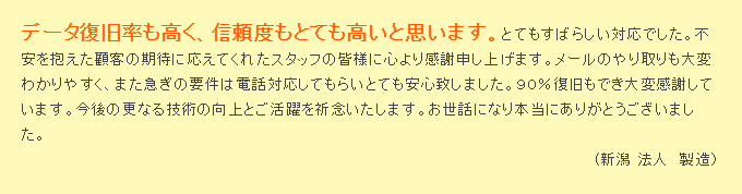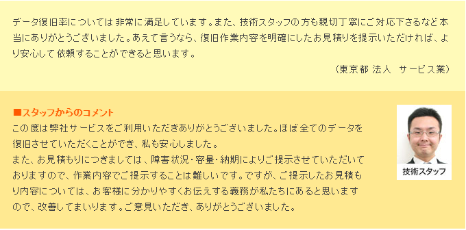 慌ててシステム担当者と話をして、なんとかデータを取り出そうと色々やってみましたが取り出す事が出来ず、インターネットで探したらリプラスさんを見つけたので電話をしてみました。本当に取り出せるか不安だったので、聞きたいことをとにかく聞いてみましたが親身に答えて頂けたので、依頼をしてみようと思いました。